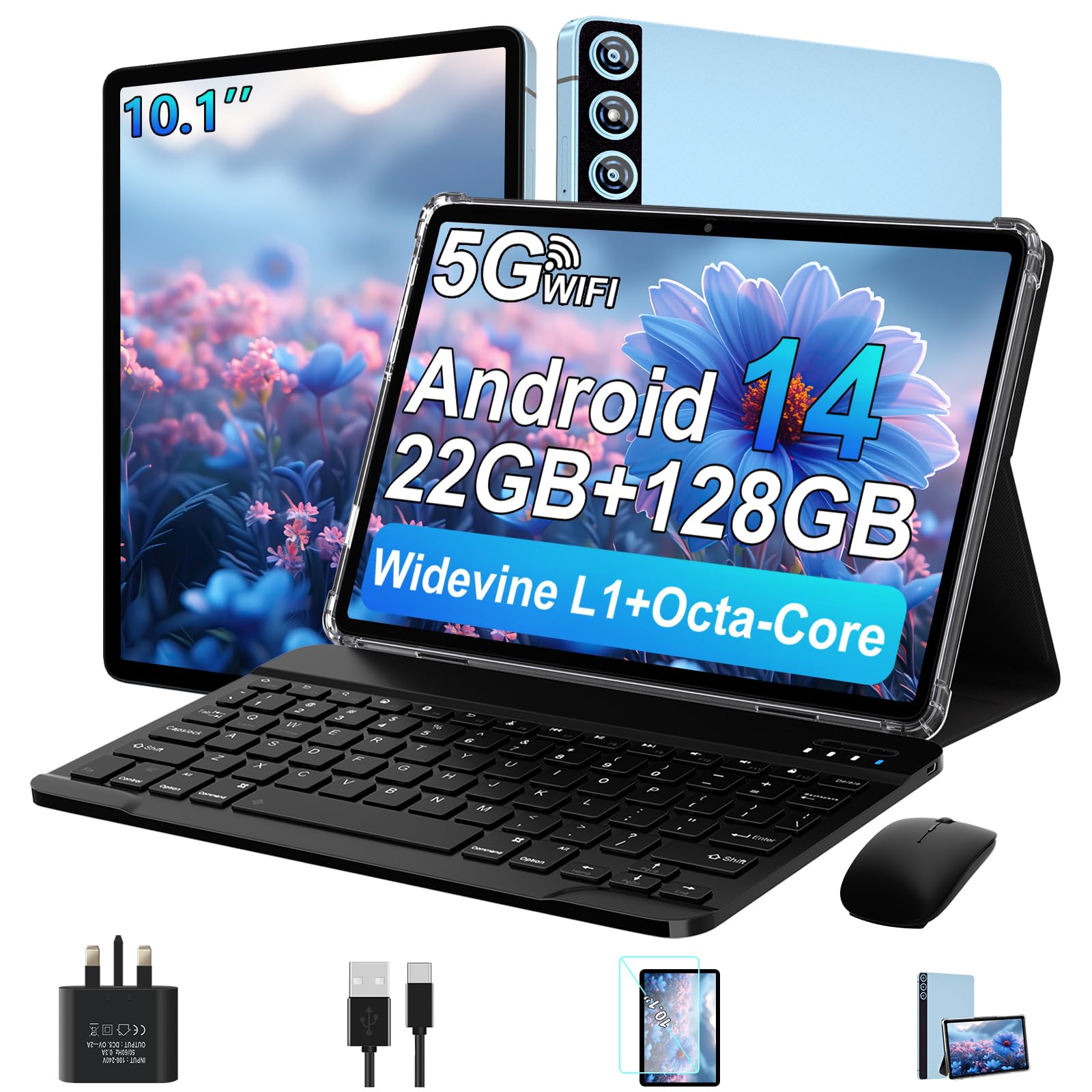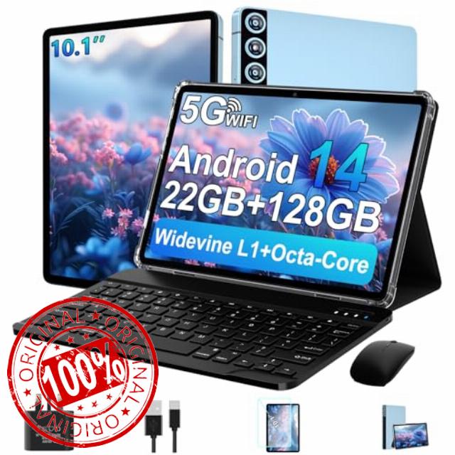 ZIOVO 2025 Newest Tablet Android 14 Tablet 10 Inch, 22GB RAM+128GB ROM(TF 1TB), 5G WiFi,Octa-Core,2.0GHz/8000mAh/ Support Widevine L1/8+5MP/BT 5.0/Widgets/2 in 1 Tablets with Keyboard & Mouse – Blue
