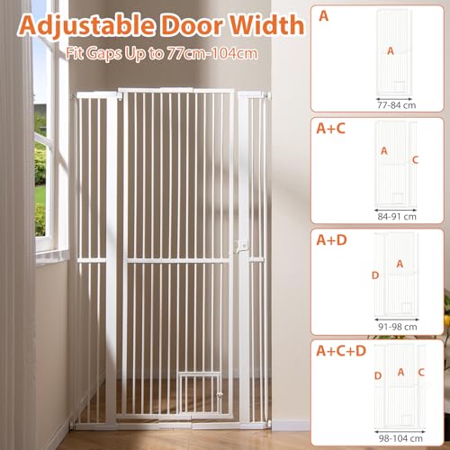 - 【Adjustable Width】The tall cat gate includes 2 different length extensions, allowing for a perfect fit in various open spaces ranging from 77cm to 104cm. It is suitable for doorways, staircases, and kitchen entries, providing you with flexibility to safeguard different areas of your home.
