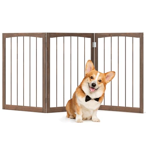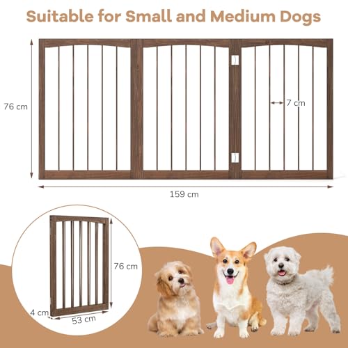 COSTWAY Wooden Dog Gate for Small and Medium Dogs, Foldable Freestanding Pet Barrier, 3-Panel Safety Fence for Doorway, Stairs, Halls (Brown, 159 x 76cm)