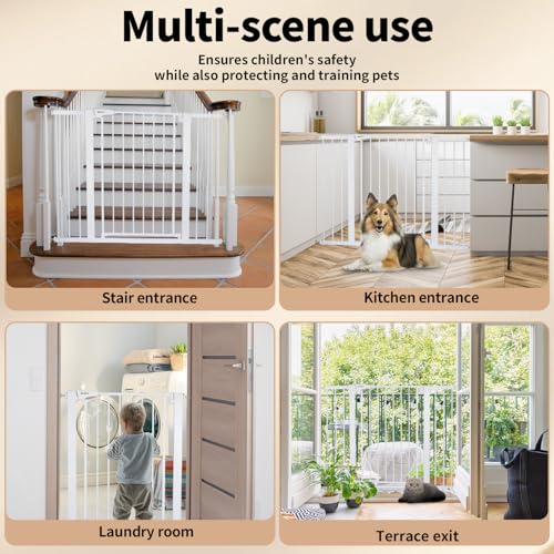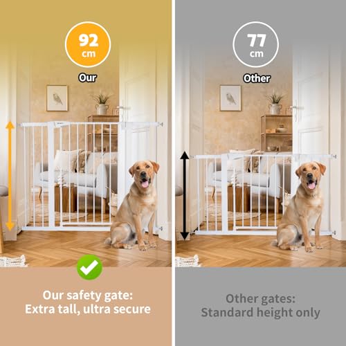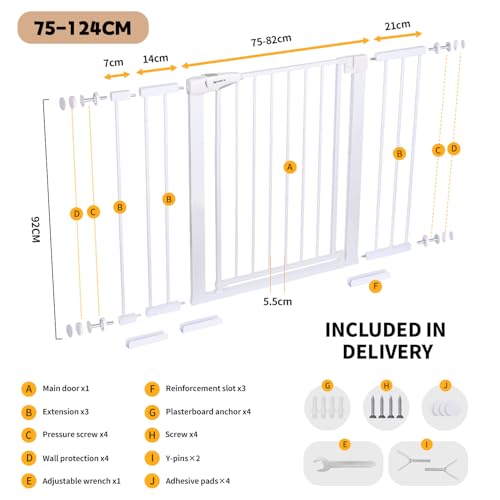 - EXTRA TALL & ADJUSTABLE WIDTH: The 92 cm high stair gate effectively prevents children from climbing over or pets from passing through. With 3 included extensions, the width can be adjusted from 75 to 124 cm – ideal for doors, hallways, or stairways of various sizes