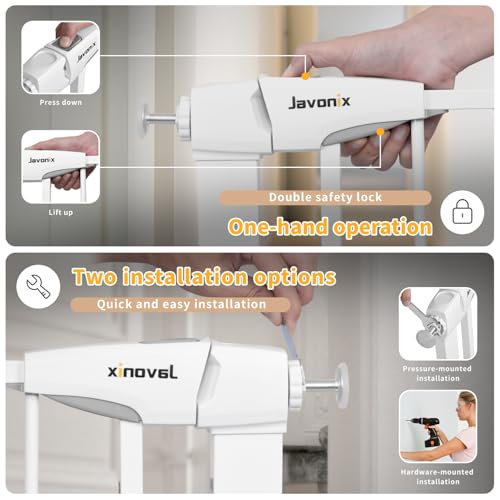 - CHILD-SAFE DOUBLE LOCK & ONE-HAND OPERATION: For added safety, the top button must be pressed and the bottom latch lifted simultaneously. This makes the baby safety gate child-proof while allowing easy one-handed operation for adults