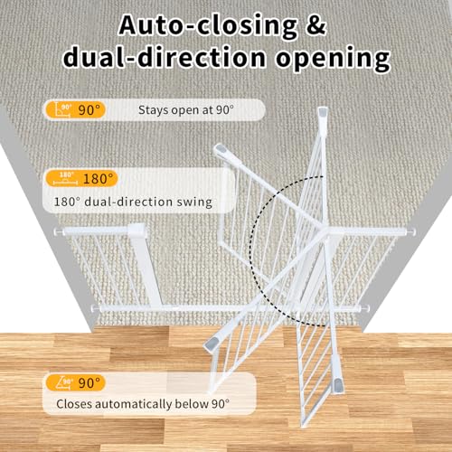 - AUTO-CLOSE, 90° HOLD & TWO-WAY OPENING: The stair barrier closes automatically when opened under 90°, and stays open at exactly 90°. The door swings open in both directions – convenient for everyday use