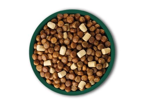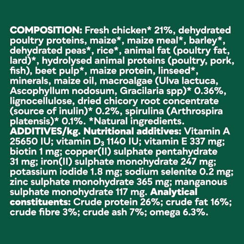 Fresh chicken* 21%, dehydrated poultry proteins, maize*, maize meal*, barley*, dehydrated peas*, rice*, animal fat (poultry fat, lard)*, hydrolysed animal proteins (poultry, pork, fish), beet pulp*, maize protein, linseed*, minerals, maize oil, macroalgae (Ulva lactuca, Ascophyllum nodosum, Gracilaria spp)* 0.36%, lignocellulose, dried chicory root concentrate (source of inulin)* 0.2%, spirulina (Arthrospira platensis)* 0.1%. *Natural ingredients.
