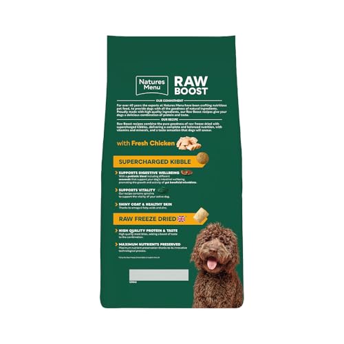 OUR COMMITMENT: For over 40 years the experts at Natures Menu have been crafting nutritious pet food, to provide dogs with all the goodness of natural ingredients. Proudly made with high quality ingredients, our Raw Boost recipes give your dogs a delicious combination of protein and taste. OUR RECIPE: After years of research and thanks to our expertise in petfood, Raw Boost recipes combine the pure goodness of raw freeze dried with supercharged kibbles, delivering a complete and balanced nutrition, with vitamins and minerals, and a taste sensation that dogs will savor. Your dog will find the best of raw in every bite.