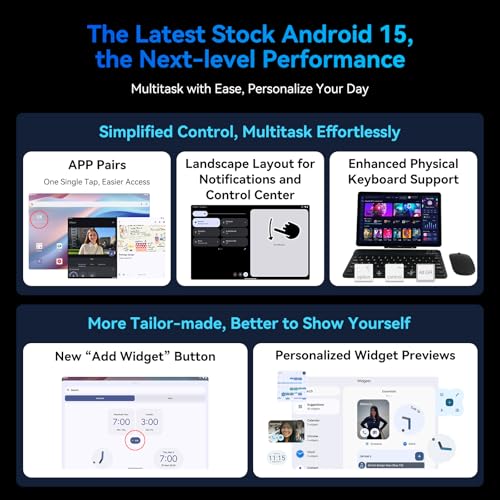 - 【Android 15 + T615 CPU + Gemini AI: Smarter, Faster, Safer】 Android 15 tablet featuring Gemini AI for smart task optimization—think auto-formatting documents or enhancing photos in seconds.The T615 Octa-core chip handles 15+ apps smoothly, you can simultaneously perform video editing, gaming, or multitasking. Dedicated privacy space keeps sensitive files secure, while cross-device collaboration syncs seamlessly with Android phones or smart home devices (a key upgrade over Android 13/14 tablets)