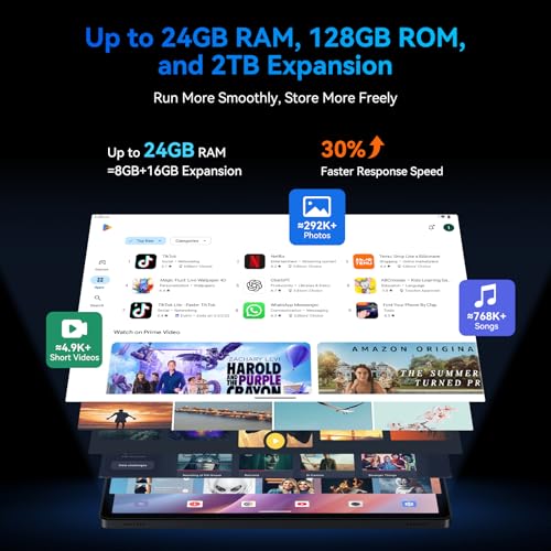 - 【24GB RAM + 128GB ROM + 2TB Expandable】Juggle work and play effortlessly with 24GB RAM (8GB physical + 16GB virtual boost) for lag-free multitasking—T90 tablet run 15+ apps, edit videos, and game simultaneously. Store 50,000+ photos, 300+ HD movies, or a lifetime of ebooks on the 128GB built-in storage, and add up to 2TB more via a microSD card. Never delete files again—perfect for photographers, students, or Netflix binge-watchers. Tips:Expand RAM in Settings