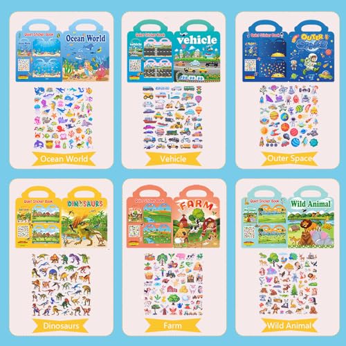 - 6 Themed Reusable Sticker Books: Each set includes 6 reusable sticker books with exciting themes: animals, vehicles, dinosaurs, farm, space, and sea creatures. These kids sticker books are specially designed for toddlers aged 1 to 2 years and older, offering a variety of scenes to explore and enjoy.