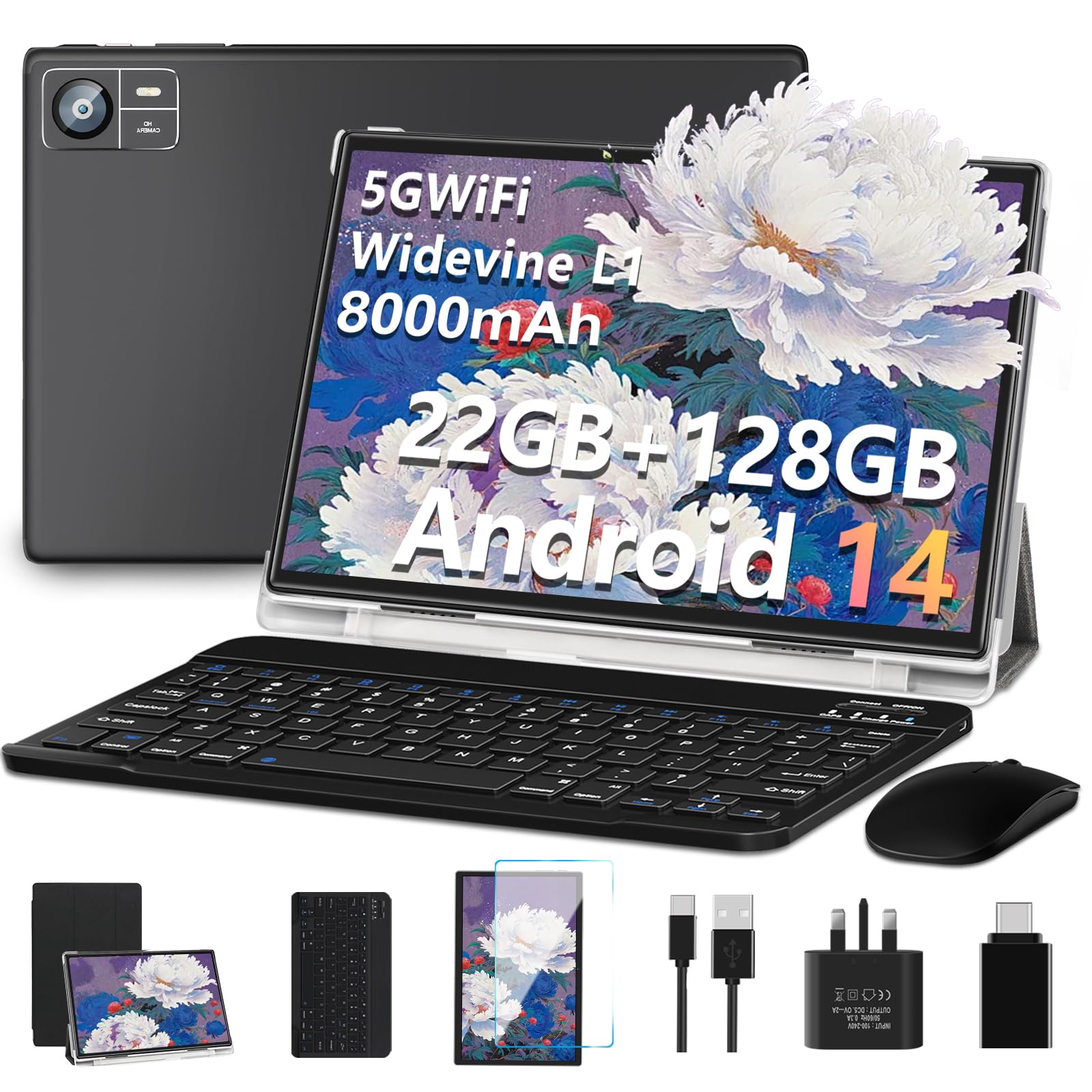 JVVQTB Tablet Android 14 10 Inch Octa Core 22GB RAM + 128GB ROM (1TB TF) | 5G + 2.4G WiFi | GPS| FHD | Bluetooth 5.0 | 8000mAh | 8MP + 5MP | Type C, Keyboard and Mouse-Dark Black