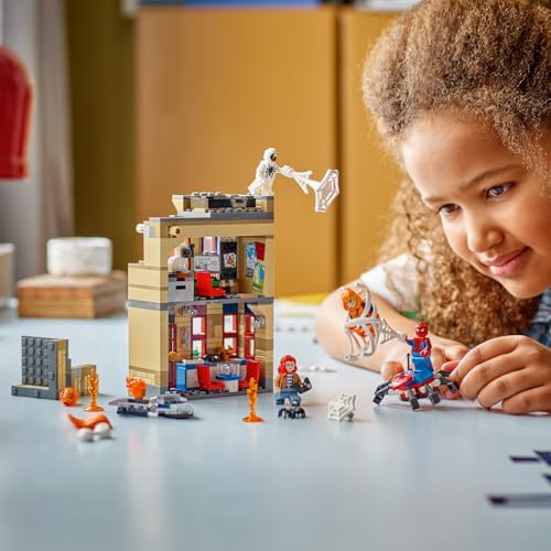- LEGO Marvel minifigures – The building set features Hobgoblin on his glider with pumpkin bombs, Spider-Man and Anti-Venom blasting webs, plus Mary Jane with a large, jointed spider robot figure Explosive action with Super Hero minifigures – Kids push a button to make part of the building collapse as they battle to protect Peter’s home and prized possessions from Hobgoblin Spider-Man toy accessories – The 2-level apartment contains a kitchen, study and bedroom and features a giant, flexible, minifigure-trapping web attached to the outside of the building