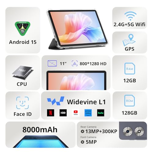 Tablet, Android 15, 11 inch Tablet with Case | T606 Octa-Core | 1280×800 HD IPS Screen | 8000mAh(with NTC)| 2.4G+5G WiFi | BT5.0 | GPS | Widevine L1 | with Usb Ports (Gray)