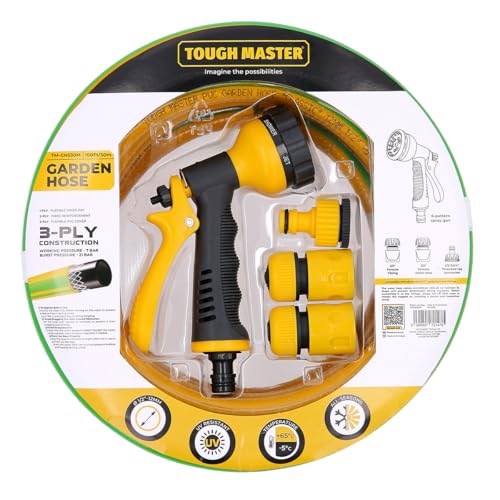 The TOUGH MASTER® TM-GHS30M PVC Garden Hose is an essential tool for outdoor watering and maintenance, making gardening and yard work more efficient and convenient. The water hose pipe is an excellent starter kit that includes a 30M PVC hose with a 1/2″ (12mm) diameter and a four-piece spray gun kit. With a length of 30m, the gardening hose is more than adequate for small to medium-sized gardens. Its 3-ply construction includes a layer of mesh fibre reinforcement to keep the garden hoses in shape, allowing you free-flowing water; the yellow protective outer layer prevents damage and guards against algae, UV radiation and all temperatures between -5°C and +65°C. To help you out in watering the plants adequately, get these hose pipes with spray gun.