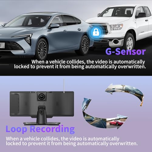 - 【4K Front Camera & 1080P Rear Camera】Our car screen is designed with 4K host front camera and 1080P high-definition rear camera, front 170° rear 140° wide-angle shooting, whether it is rain and fog weather or dark night, android auto screen can provide high-definition recording. With a 64GB SD card, it can start looping recording when inserted, automatically overwriting earlier recording (except for locked video: automatically lock video when a vehicle collides)