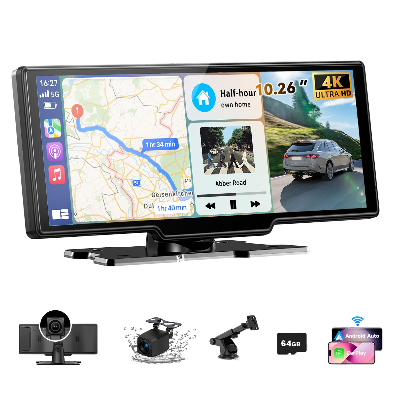10.26″ Car Tablet Pro Max 2025: Wireless Carplay Screen for Car with 4K Front and 1080P Rear Camera, Android Auto Screen IPS Touchscreen/Mirror Link/Loop Recording/G-Sensor/Navigation / 64G SD
