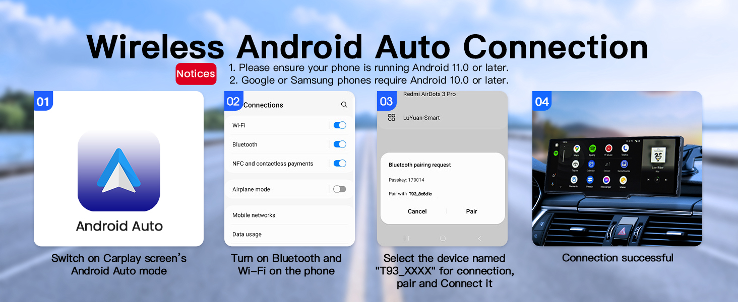 - 【Wireless Apple Car Play/Android Auto】With wireless Apple CarPlay/Android Auto connectivity, you can easily use apps like Waze, Google Maps, Spotify and more. Siri/Google Assistant voice control for navigation, music playback and hands-free calling through bluetooth.