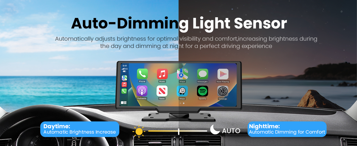 - 【Intelligent Brightness-Adjustable Touchscreen】 The Rionhex Portable Apple CarPlay system features an adaptive light-sensing touchscreen. It intelligently senses day and night conditions, the function that can automatically adjust the screen brightness instead of manual adjustment ensures a driving experience free from discomfort and glare.