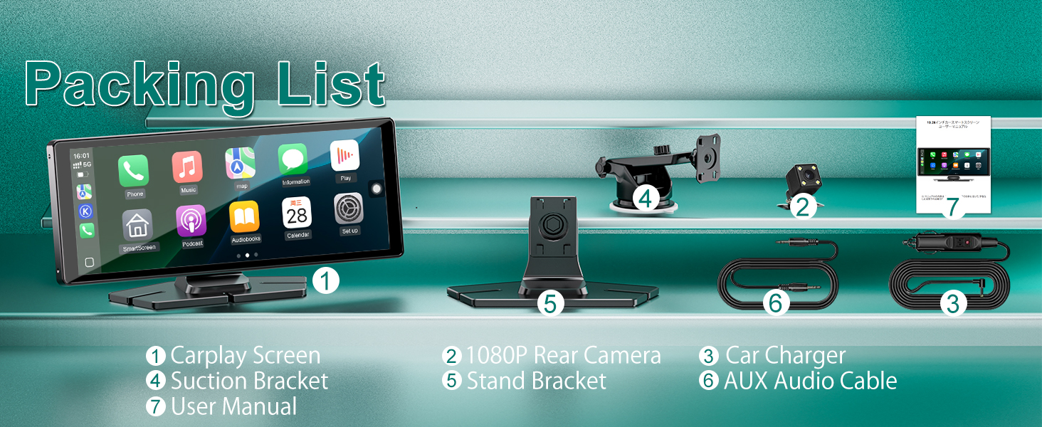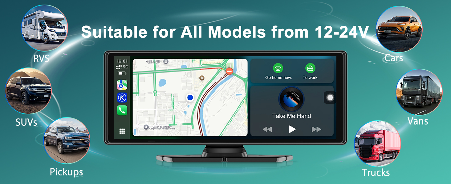 - 【Universal Installation】No tools or complicated wiring required! The Carplay touch screen plugs into your car's cigarette lighter (7-32V) and installs easily with the included suction cup or dashboard sticky pad. Compatible with cars, trucks, SUVs and even older models without built-in screens, it's a hassle-free upgrade for any vehicle.