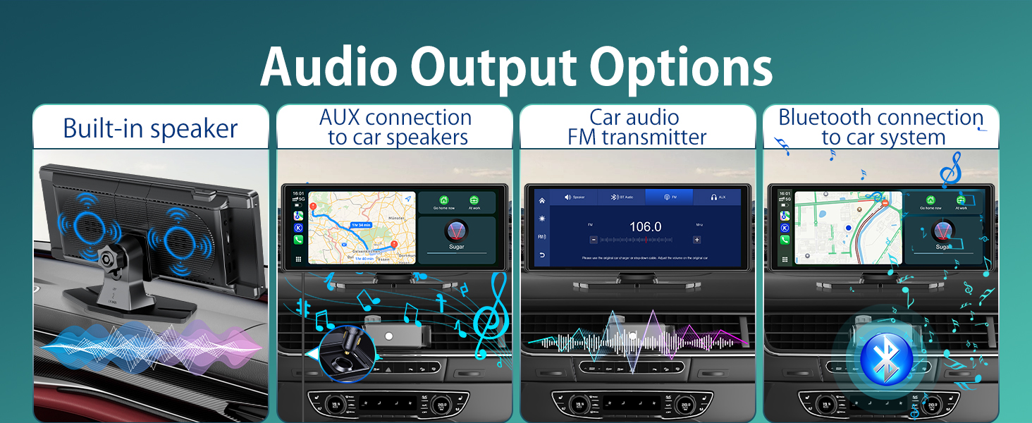- 【Multiple Audio Options for Apple Car Play Screen】Enjoy your favorite sounds your way! Stream music wirelessly from your phone via Bluetooth, or use an AUX cable/FM transmitter for older cars without Bluetooth. The built-in speakers deliver crisp audio, while dual Bluetooth support lets you pair for Apple Car Play Screen with both your phone and car stereo simultaneously—no need to switch between devices.