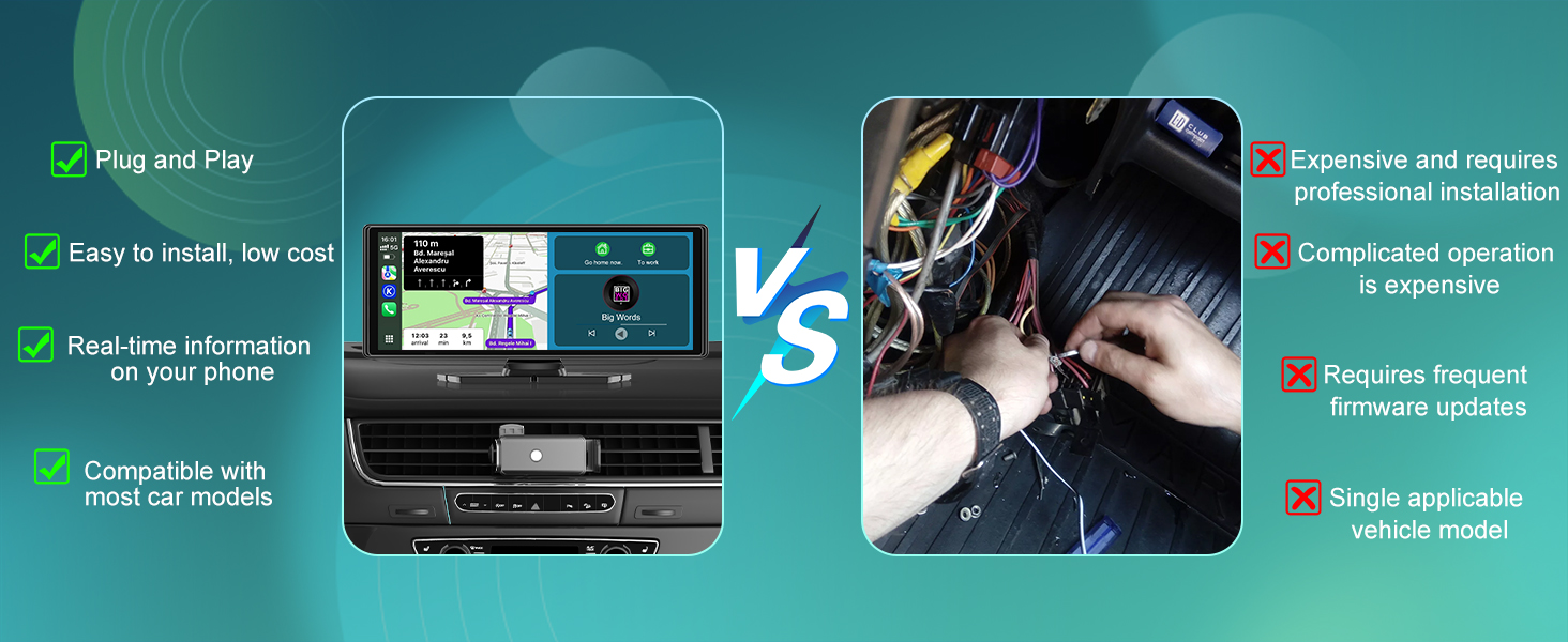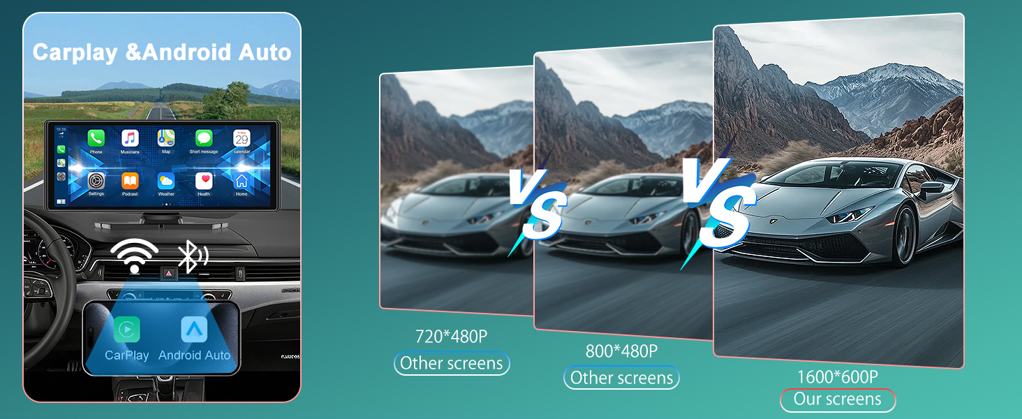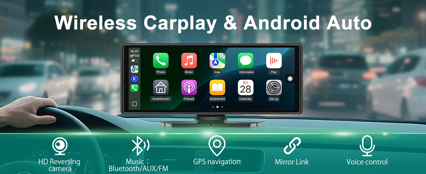- 【Wireless Connection】:Compatible with A-pple Carplay and Android Auto.When you are driving your car, your mobile phone can be connected to the in-car CarPlay screen to access maps, music, calls, and messages via touch or voice commands (Siri/Google Assistant). No wires, instant connectivity. Real-time traffic updates and hands-free control. Focus on driving, not your phone.