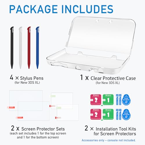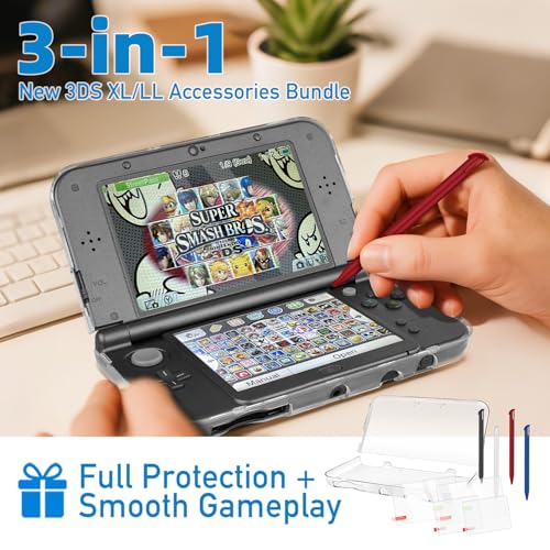 - 3-in-1 Kit for New Nintendo 3DS XL/LL – Includes a clear protective case, 2 screen protectors (tempered glass + PET film), and 4 replacement stylus pens for daily use and travel.
