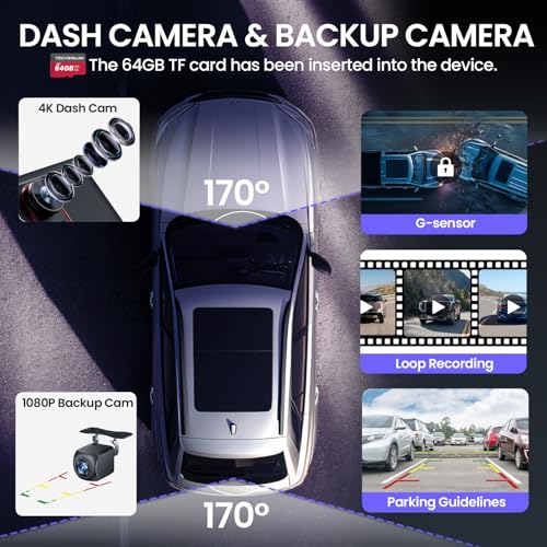 - ➤ 【4K Dash Cam + 1080P Rearview Camera】 This dual-camera carplay screen features a 4K dash cam with a built-in G-sensor that automatically detects collisions and locks footage to protect critical evidence. The 1080P rearview camera activates instantly when you shift into reverse, providing a clear, wide-angle view with customizable guide lines for safer and more precise parking. With loop recording and a pre-installed 64GB TF card, you’ll never run out of storage space.