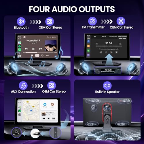 - ➤ 【High-Quality & Stable Audio Output】 Equipped with advanced Bluetooth technology, this wireless carplay screen with dash cam allows you to stream audio wirelessly to your car’s stereo speakers for a lossless music experience. (You can also connect via Bluetooth, FM, or AUX.) Additionally, the screen features built-in high-quality speakers for exceptional sound.