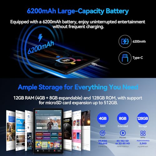 - 【6200mAh Large Battery & 12GB + 128GB + 512GB Storage】Equipped with 12GB of RAM (4GB + 8GB virtual) and 128GB of storage, expandable up to 512GB, the iPlay 60S tablet offers seamless multitasking and ample storage for all your content. Its 6200mAh battery ensures long-lasting use without frequent recharges. Additionally, the built-in gravity sensor automatically adjusts the screen's orientation for the optimal viewing angle