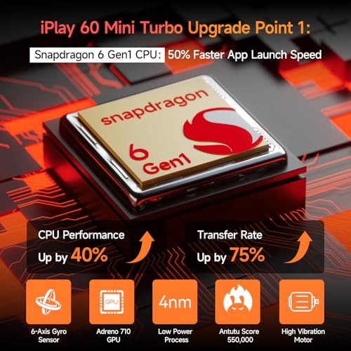 - 【Snapdragon 6 Gen 1 CPU + Adreno 710 GPU】Equipped with the latest Android 14, the iPlay 60 mini Turbo tablet features the Snapdragon 6 Gen 1 CPU with 4 high-performance Cortex A78 cores (2.2GHz) and 4 power-efficient Cortex A55 cores (1.8GHz). This 4nm processor delivers 40% faster speeds and improved power efficiency compared to Helio G99, perfect for multitasking and handling complex data. The Adreno 710 GPU enhances graphics, providing smooth animations and rich visuals for gaming and video