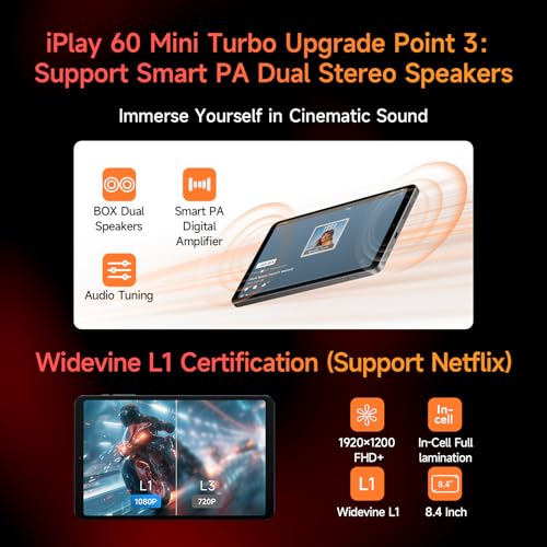 - 【4K Video Decoding + Dual Speakers + Widevine L1】Experience 4K clarity in the palm of your hand with 4K video decoding. Easily cast to a 100-inch screen using DP or USB-C to HDMI for a cinematic experience. Dual speakers with smart amps (AW88261) deliver louder, richer sound. The 8.4-inch 1920×1200 FHD display (270 PPI) offers sharp visuals at 350 nits. Additionally, the tablet is Widevine L1 certified, allowing HD streaming on platforms. Weighing just 323g, this lightweight tablet is perfect for entertainment anywhere