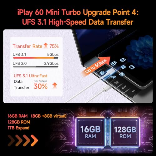 - 【USB 3.1 Gen1 Type-C + UFS3.1 Transfer】This tablet features 8GB RAM (plus 8GB virtual RAM) and 128GB storage (expandable to 1TB). Powered by LPDDR5 memory, it ensures smooth, lag-free performance for your favorite apps and games, even with multiple apps running in the background. Energy-saving tech extends battery life, making it a nice travel companion. The USB 3.1 Gen1 Type-C port offers OTG, fast charging, data transfer, and headphone jack support. UFS 3.1 boosts data transfer speeds up to 5Gbps, 10x faster than standard USB 2.0, with 30% faster app installs