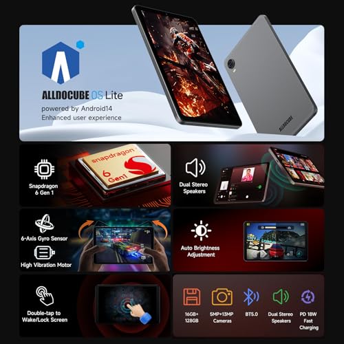- 【ALLDOCUBE OS Lite + 5500mAh Battery】The iPlay 60 Mini Turbo tablet, powered by Android 14 and ALLDOCUBE OS Lite, offers smooth performance and user-friendly features. Enjoy automatic brightness adjustment, a smart dock, double-tap to wake or lock (once enabled in settings), and easy multitasking with single-finger app switching, two-finger split screen, and three-finger screenshot capture. It’s equipped with a 5500mAh battery and supports PD 18W fast charging, fully charging in just 2.5 hours—50% faster than traditional chargers (5V/2A). (PD 18W charger sold separately)