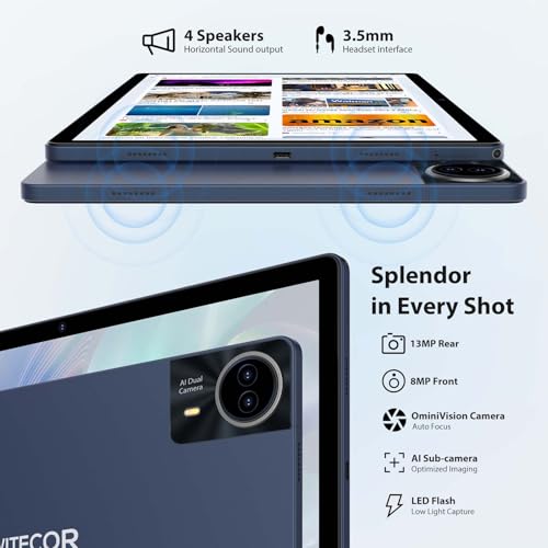 - 【4 Speakers + Dual AI Cameras】The WITECOR A14 tab boasts four stereo speakers with noise-cancellation technology, delivering an exceptional audio experience. The 8MP front camera is perfect for clear video calls, while the 13MP rear camera captures every moment in stunning detail. Additionally, it features a 3.5mm headphone jack and FM radio for added entertainment options.