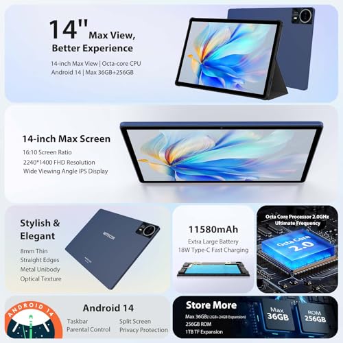 - 【36GB + 256GB +1TB】Equipped with an 8-core processor clocked at 2.0 GHz, 36GB RAM (12GB + 24GB expandable), and 256GB of internal storage, this tablet ensures smooth multitasking, gaming, and app performance. Need more space? Expand the storage up to 1TB with a microSD card, so you’ll never run out of room for your favourite photos, videos, and apps. Running the latest Android 14 operating system, the WITECOR Tablet offers enhanced privacy settings and security controls for your data.