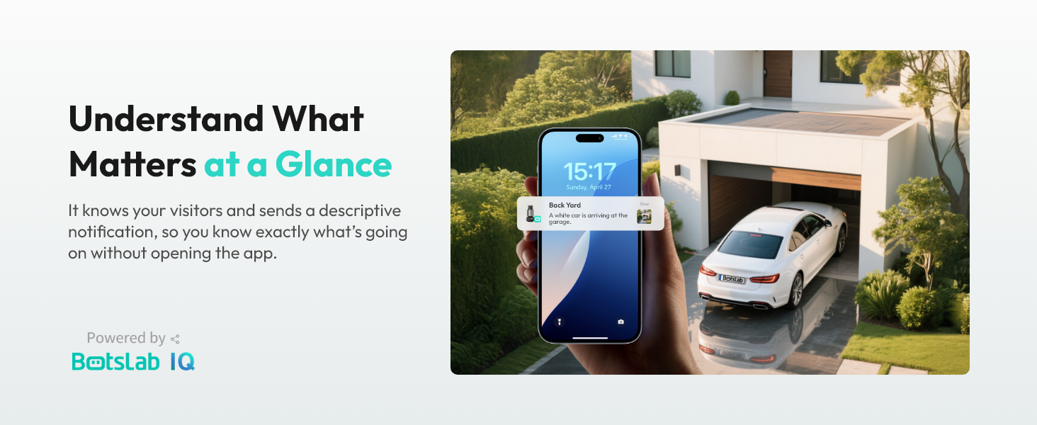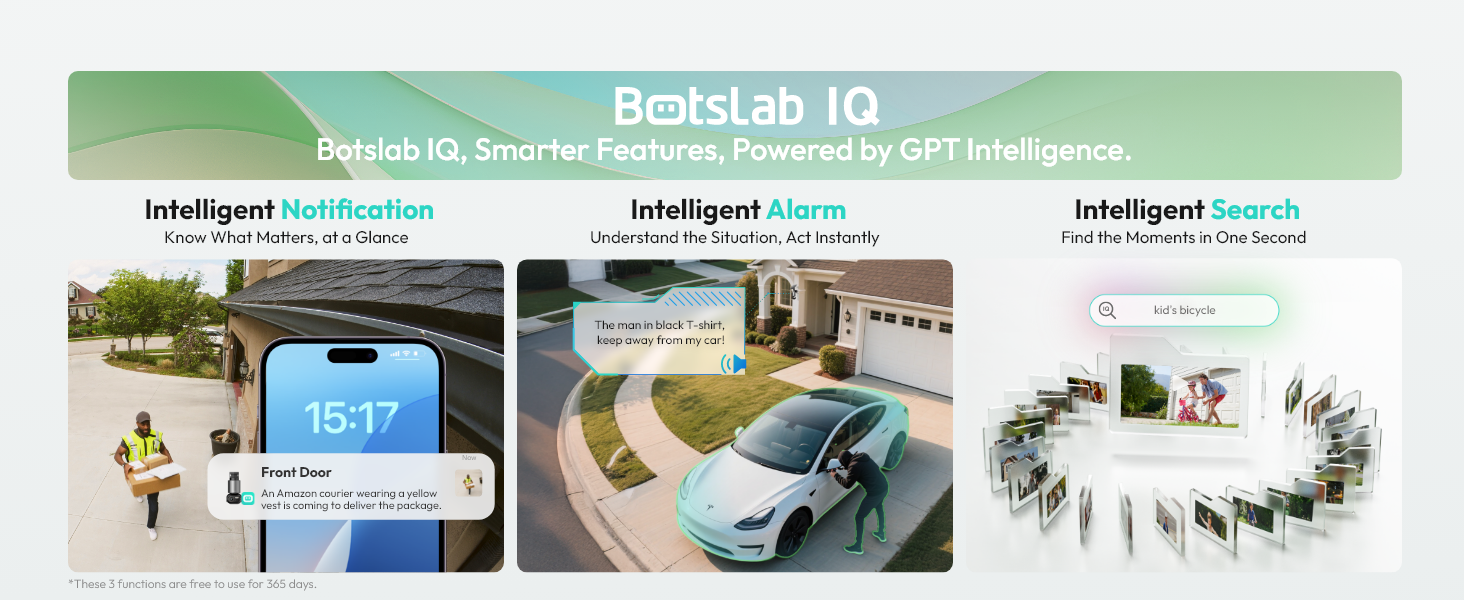 - [BOTSLAB IQ, Smarter and More Convenient] BOTSLAB security camera is equipped with BOTSLAB's latest AI technology. It not only supports intelligent search, you can quickly search for the video you want to see directly through the scene keyword, but also supports intelligent recognition. BOTSLAB IQ can tell whether the scene currently shot by the surveillance camera needs to be reminded. You don't need to look at your phone all the time to understand what happened, which can also reduce your being disturbed by unnecessary reminders. Of course, if there is an abnormal situation, BOTSLAB IQ will also send an alarm to suspicious persons, becoming your home safety assistant.