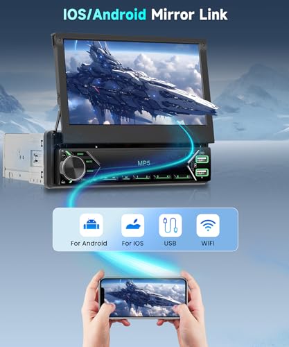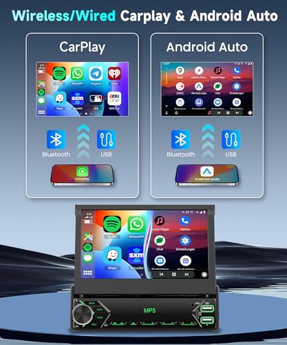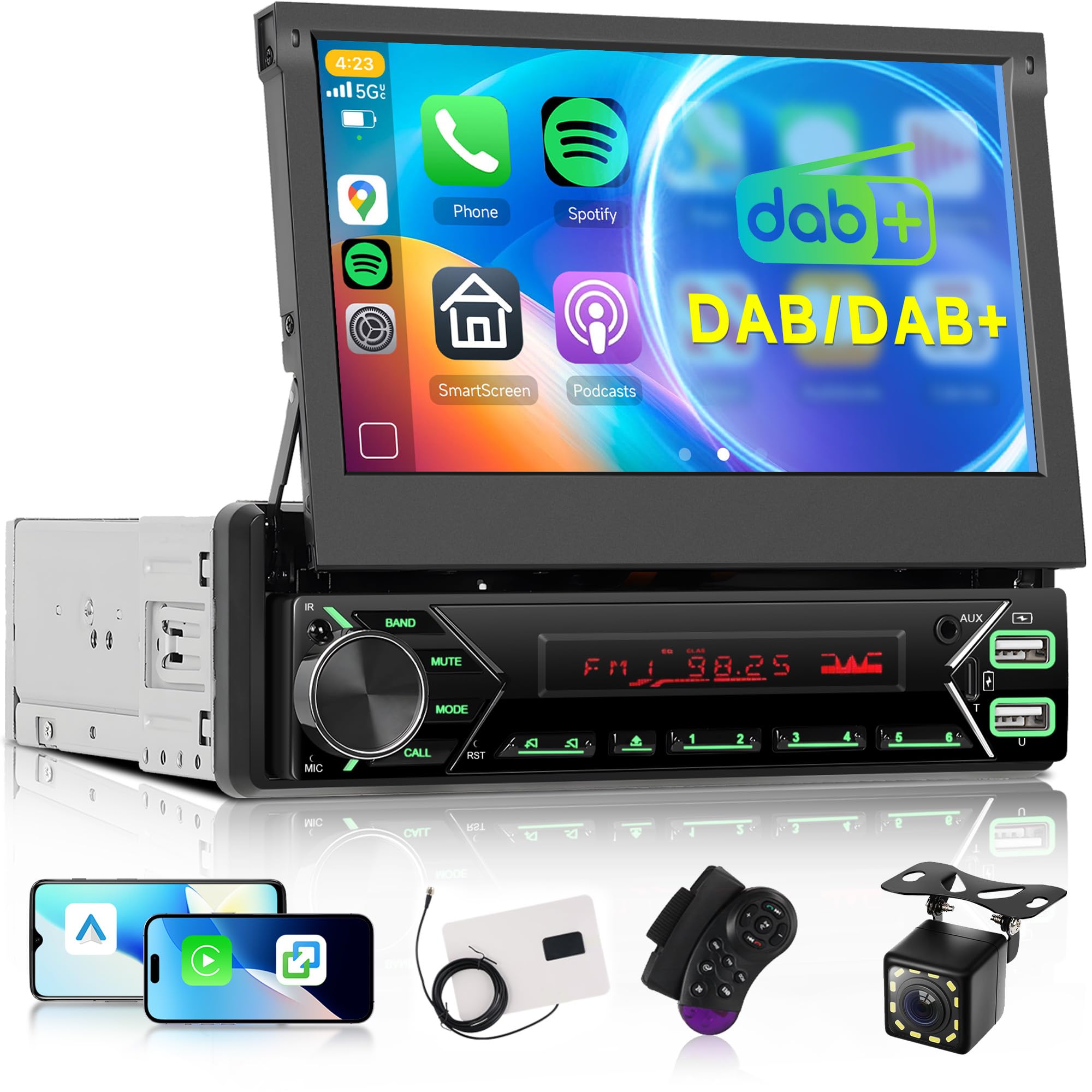 DAB/DAB+ Single Din Car Radio with Wireless Carplay Android Auto, 7 inch Electric Flip Out Touch Screen 1 Din Car Radio with Bluetooth EQ Mirror Link FM USB Type-C AUX Backup Camera