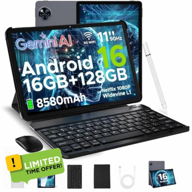 DOOGEE U11 2025 Newest Android 16 Tablet 11 Inch, Gemini AI Android Tablets Octa-Core 16GB RAM 128GB ROM(TF 2TB), 8580mAh Battery, Widevine L1|3.5mm Jack|GMS|5G WiFi Tablet with Keyboard&Pen, Gray