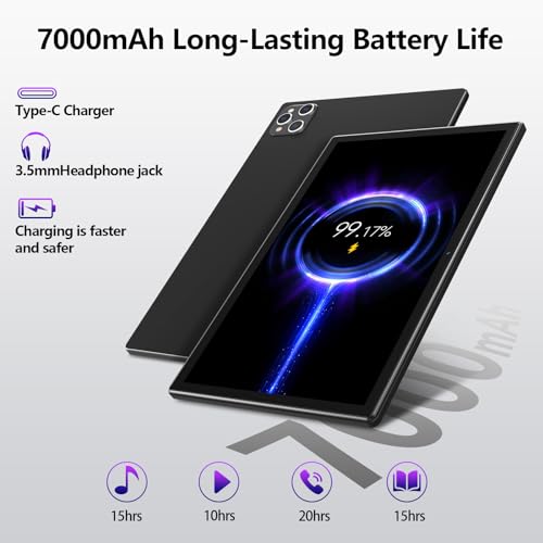 - 【LONG LASTING BATTERY&7000mAh BATTERY】This portable tablet Equipped with 7000mAh large capacity battery that lasts up to 12 hours on a single charge. You can enjoy reading, browsing, watching movies and playing games.The long-lasting battery life and lightweight design allow you to enjoy your tablet anywhere, anytime.Suitable for long commutes and travels.