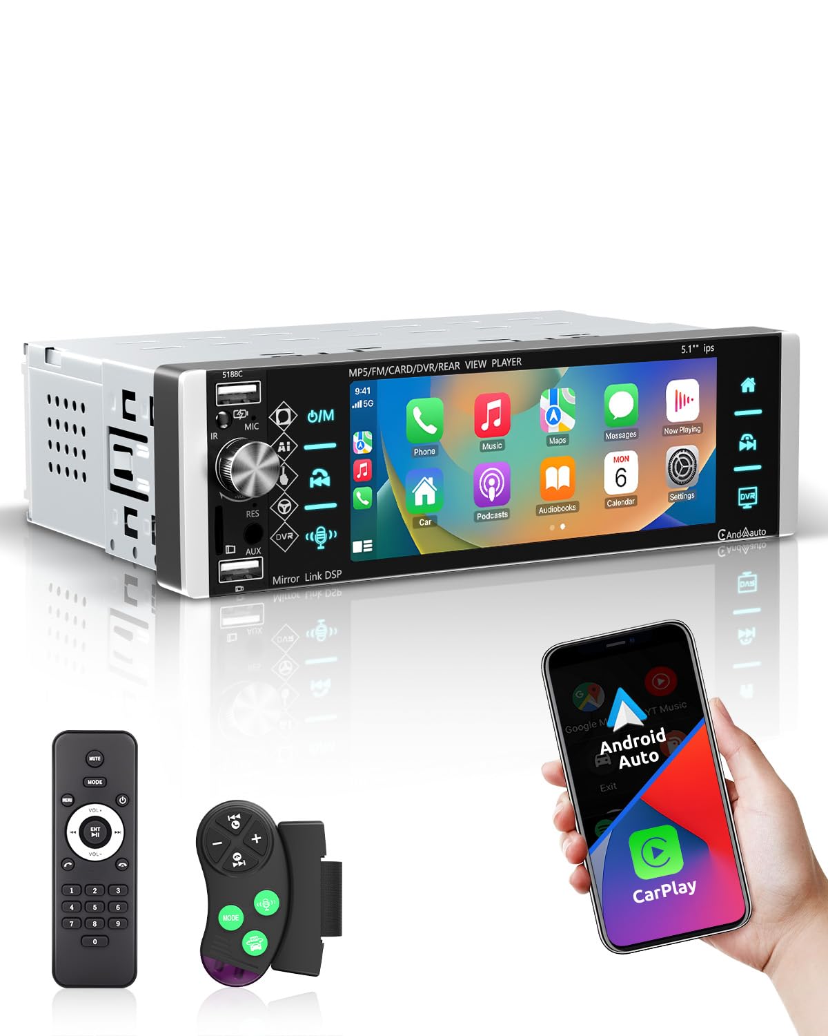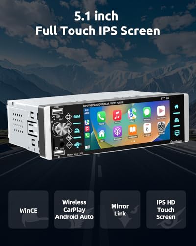 ESSGOO Car Stereo with Wireless Carplay and Android Auto, 5.1 Inch Single Din HD IPS Touchscreen Auto Radio Receiver with Bluetooth Voice Control FM Mirror Link