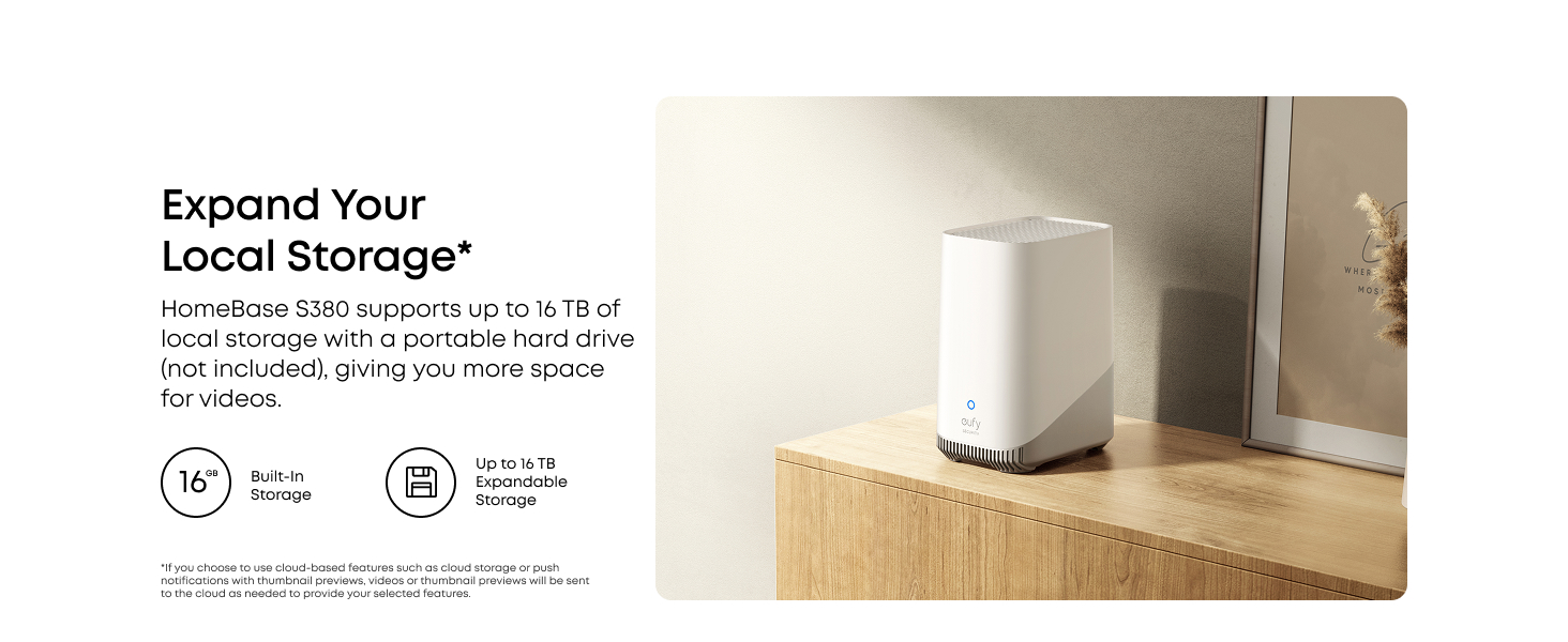 - Included: HomeBase S380 comes with 16 GB built-in storage, expandable up to 16 TB, and supports continuous recording even during network outages. We recommend using the included HomeBase S380 for best performance. If you already have a HomeBase 3, please update to firmware V3.6.9.0 or later, and update to app V5.0.80 or later.