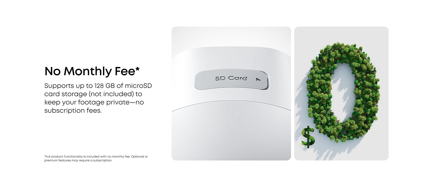 - : Supports up to 128 GB of microSD storage to keep your footage private—no subscription fees. Note: microSD card not included.