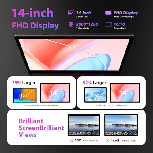 - 【13 MP rear camera + 8 MP front camera + 14-inch Incell FHD screen 】The 13 MP main camera captures rich details and delivers clear, detailed images suitable for high-quality photos. The 8 MP camera provides an additional angle of view or can be used for special functions such as wide-angle shots or depth perception. The 14-inch tablet PC with Incell large screen technology offers a thin and lightweight design, high display effect, precise touch experience, and a smoother touch experience due to the close integration of the touch layer with the display, which reduces the possibility of misoperation.