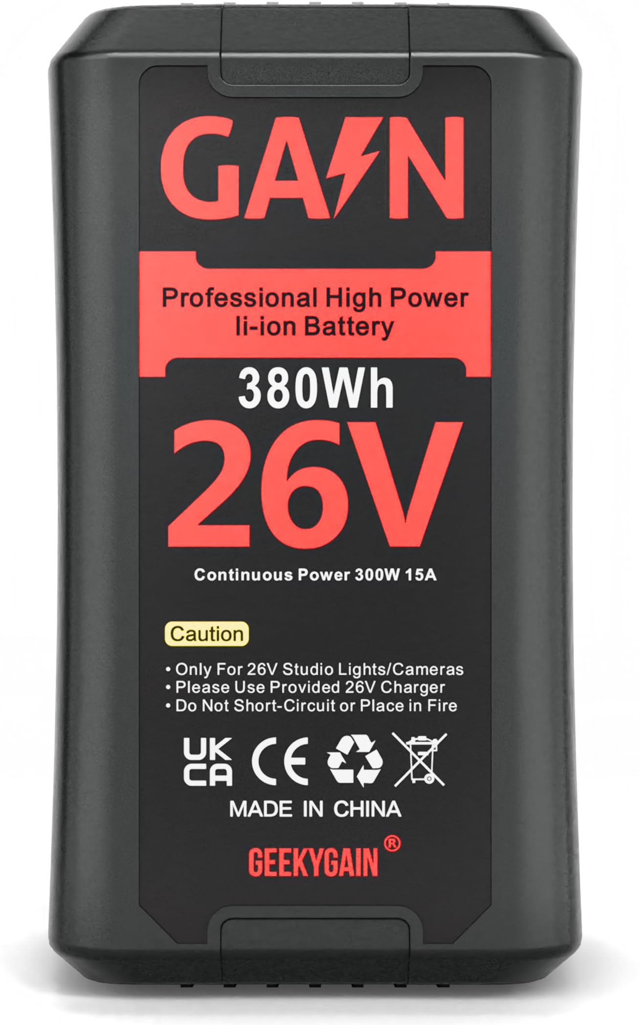 GA!N 26V 380Wh Lithium-Ion Battery – High 14615 mAh Capacity V-Mount Rechargeable Battery with D-Tap Output for Aputure 600d, Nanlite Forza 500, 500B II, LED Video Lights, V-Lock Power Supply