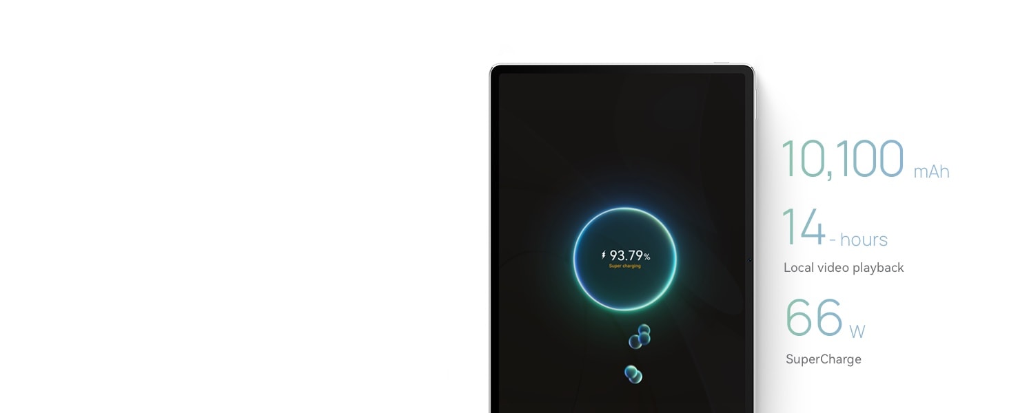 - 【Ultra-long Battery Life】With a massive 10,100 mAh battery and a 66 W SuperCharger, you never need to worry about being left in the lurch. The tablet can support up to 14 hours of local video playback.