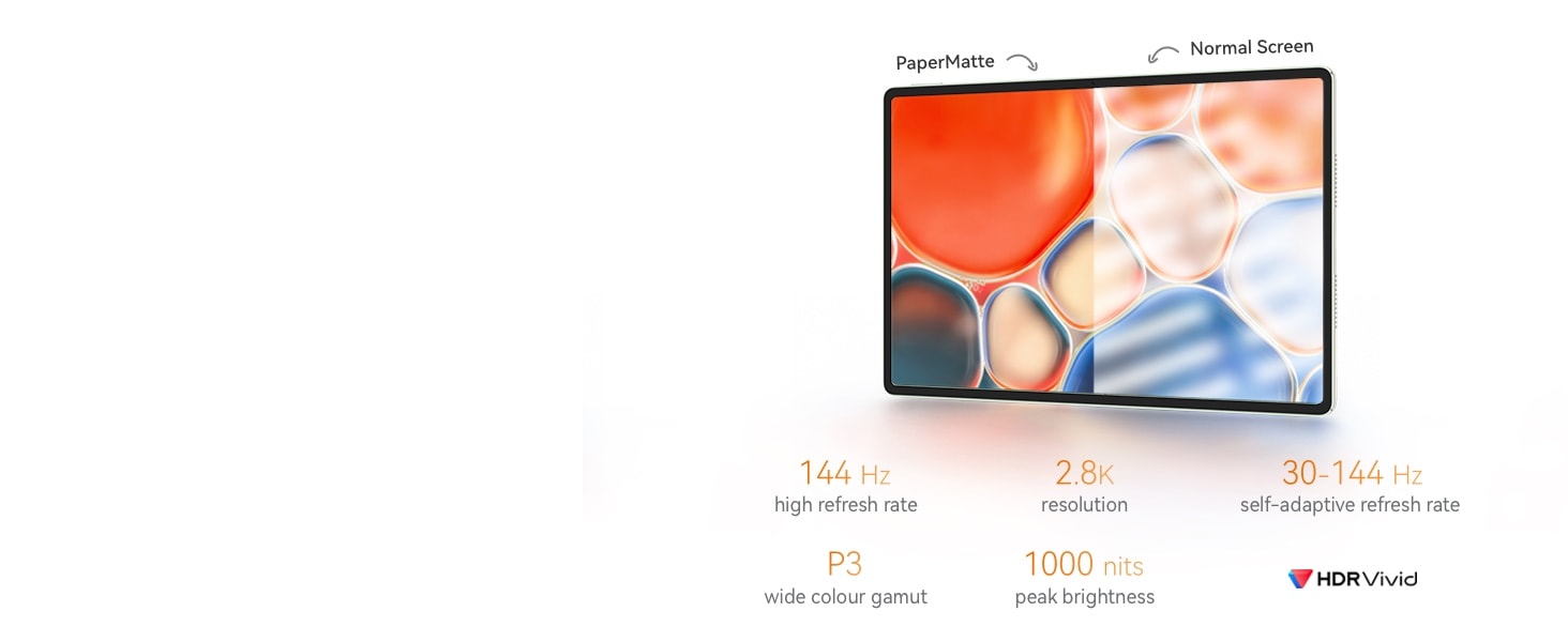 The tablet delivers a 1000 nits peak brightness for crystal-clear browsing and reading, even under strong sunlight. Its 30–144 Hz self-adaptive refresh rate makes frame freezing a thing of the past.