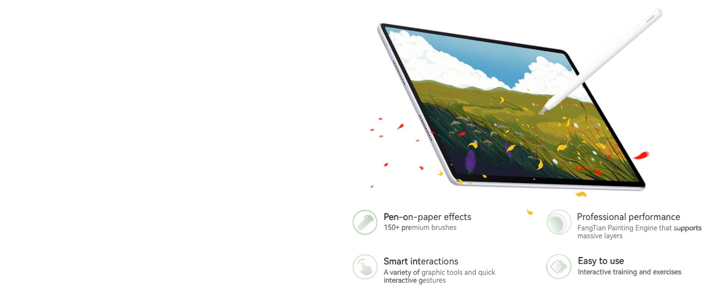- 【Professional and Easy-to-use GoPaint App】:HUAWEI GoPaint App is designed to fuel your creative vision no matter you are a seasoned artist or a passionate enthusiast, by providing handy features including 150+ fine-tuned brushes, custom canvases, and more. A nanoscale texture design of PaperMatte Display offers unique micro-vibration. Embrace paper-like writing and navigate with the HUAWEI M-Pencil (3rd generation) to recreate the rustle and bustle of pen on paper.