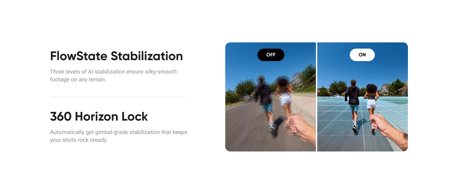 - Reliable Stabilization – With 3 levels of FlowState Stabilization and 360 Horizon Lock, your shots will always be smooth and level.