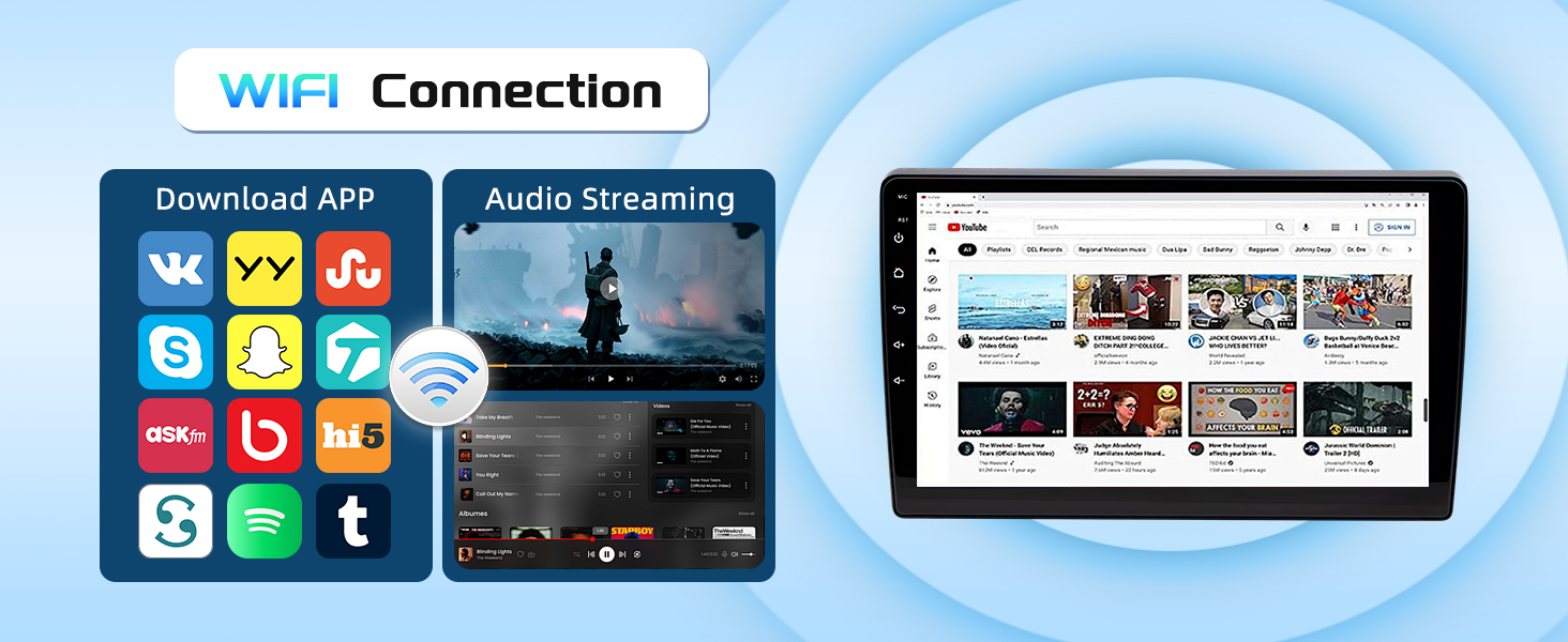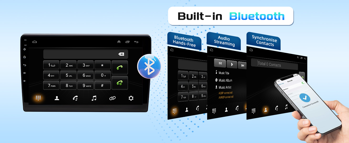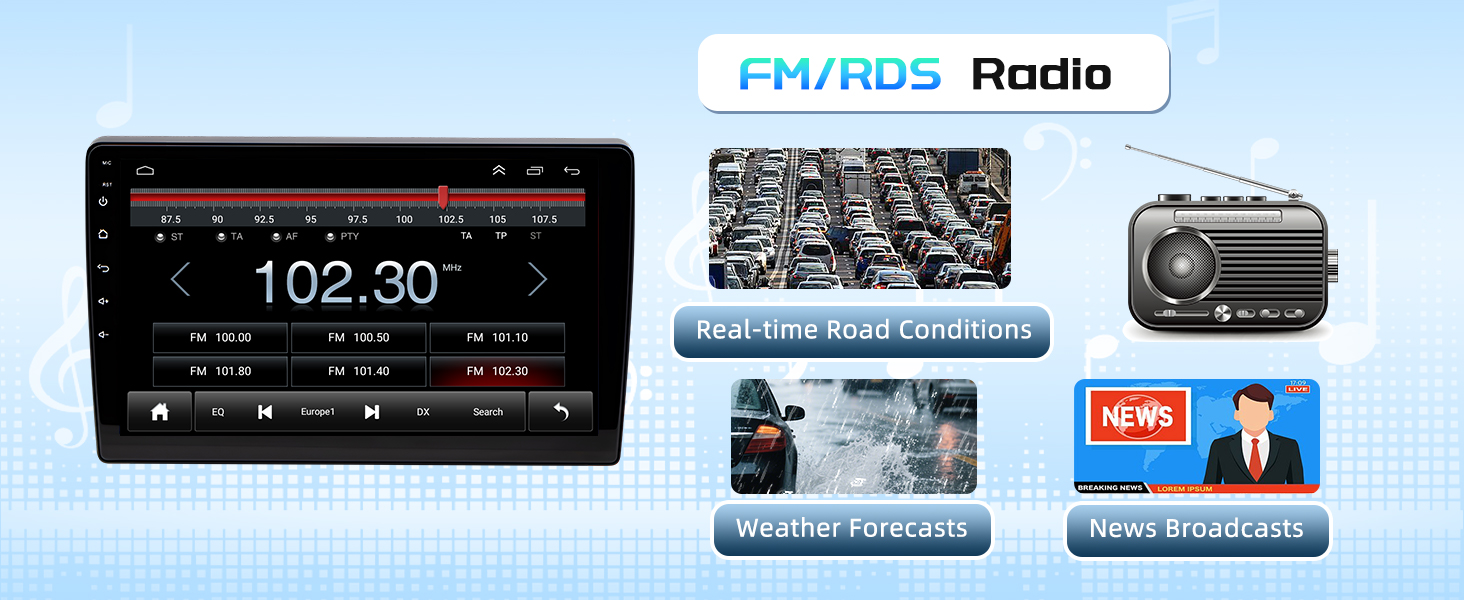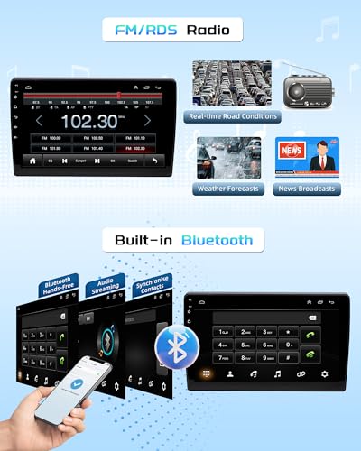 - -Android Car Stereo built-in Wi-Fi for software updates and streaming media; Built-in Bluetooth for music playback and hands-free calls. FM/RDS radio provides clear radio reception and information display (station name, current song title).