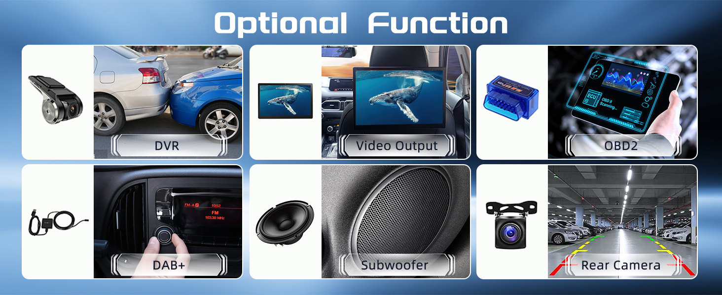| Optional Function | -Supports external devices: DVR, video output, OBD2, DAB+, subwoofer, reversing camera. (Note: Not included in the package, please purchase separately if required.) |
