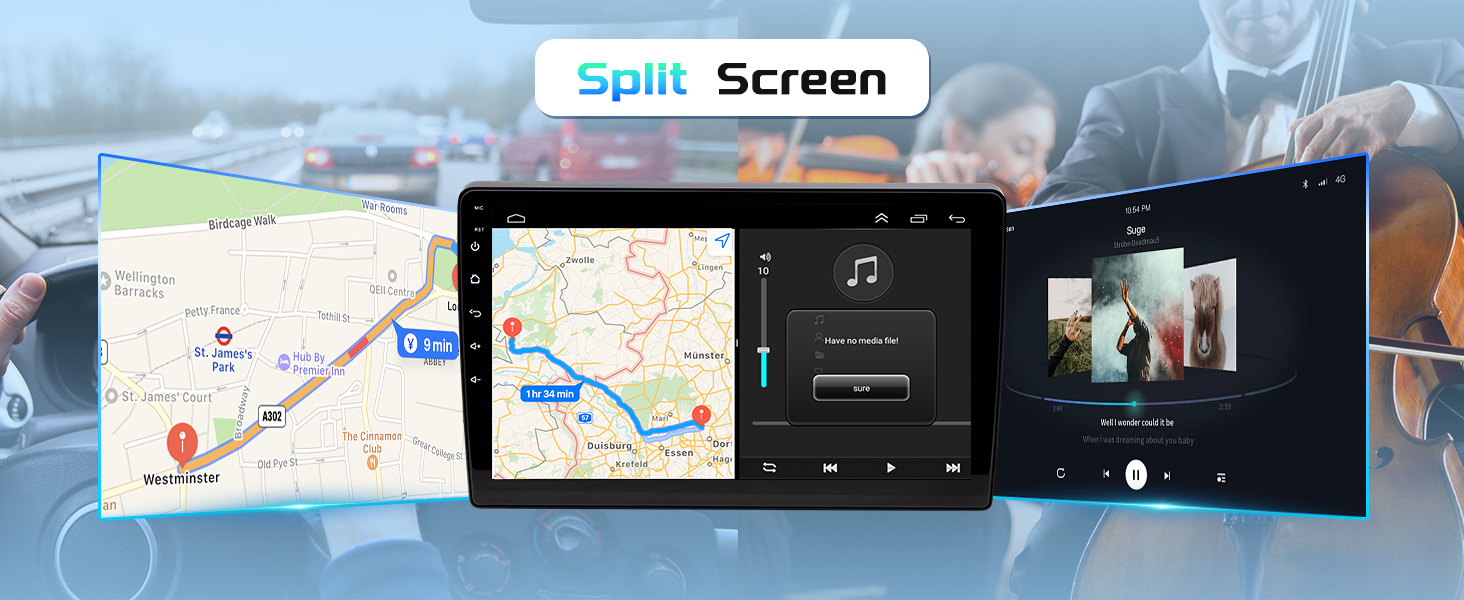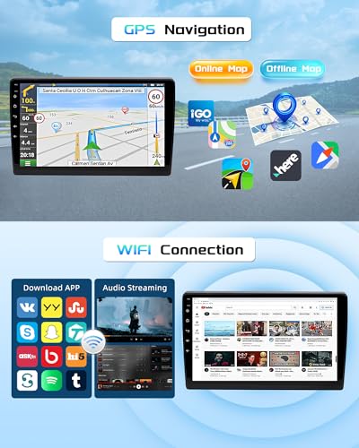 - [Sat Nav & Split-Screen]-Android head unit equipped with reliable GPS to meet all your travel needs. Supports online and offline navigation, so you can navigate with confidence without relying on your mobile phone. – Split-screen function allows you to use two applications simultaneously (e.g. GPS navigation + music player).