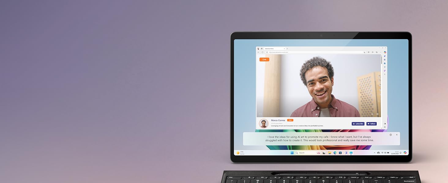 [2] Optimized for select languages (English, Chinese (simplified), French, German, Japanese, and Spanish. Content-based and storage limitations apply. [3] 6GHz band not available in all regions. [4] Options with 5G coming later in 2024. 5G not available in all areas; compatibility and performance depends on carrier network, plan and other factors. [5] Battery life varies significantly based on usage, network and feature configuration, signal strength, settings, and other factors. [6] Available colours may vary by market. [7] Currently supports translation for video and audio subtitles into English from 40+ languages. [8] HDR requires HDR content and enabling HDR in device settings. [9] Supporting 3 external displays requires either 2 displays connected to a compatible dock or connected through daisy chain. [10] Sold separately. Software license required for some features. [11] Detached use requires Windows 11.