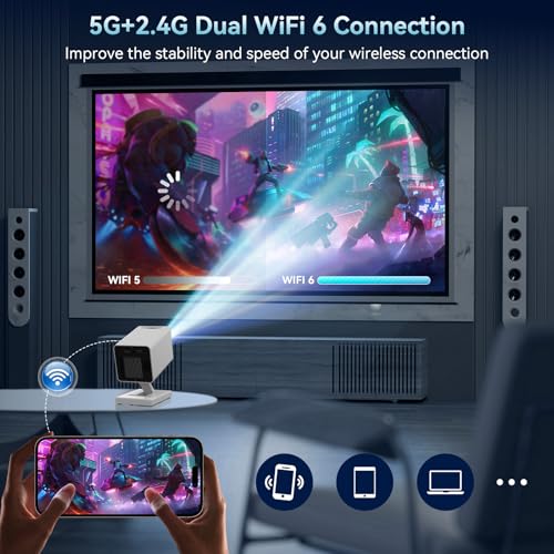 - 【Dual-Band WiFi6 & Bluetooth 5.2】 The video projector uses the latest WiFi6 connection technology, which enables an ultra-fast connection in just a few seconds, so you can play games and watch movies without delay. Due to dual-band WiFi6 technology, you can easily connect to various Bluetooth speakers/headphones without cables and enjoy an immersed audiovisual experience. At the same time, also has a built-in cinema-quality HIFI speaker (3W*1), so you and your family can experience home theater anytime, anywhere.